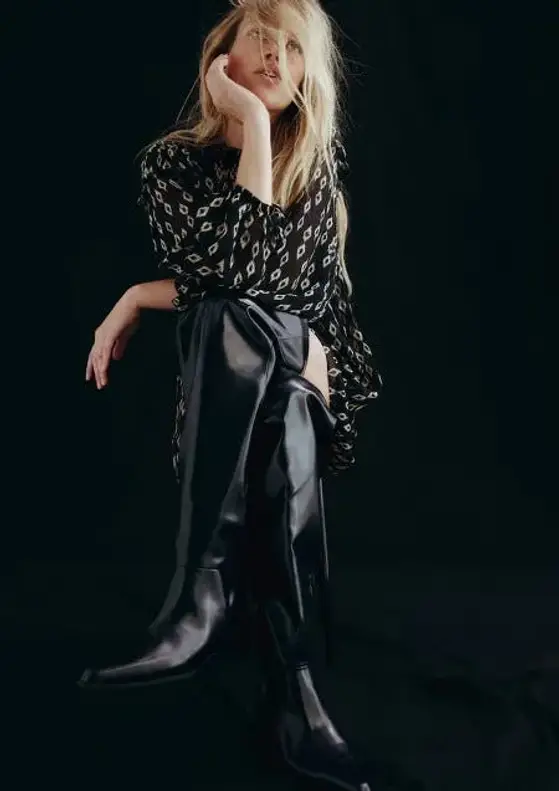 Over-the-knee boots in coated fabric. Pointed toes, zipper at one side, and low block heels. Lining and insoles in satin.